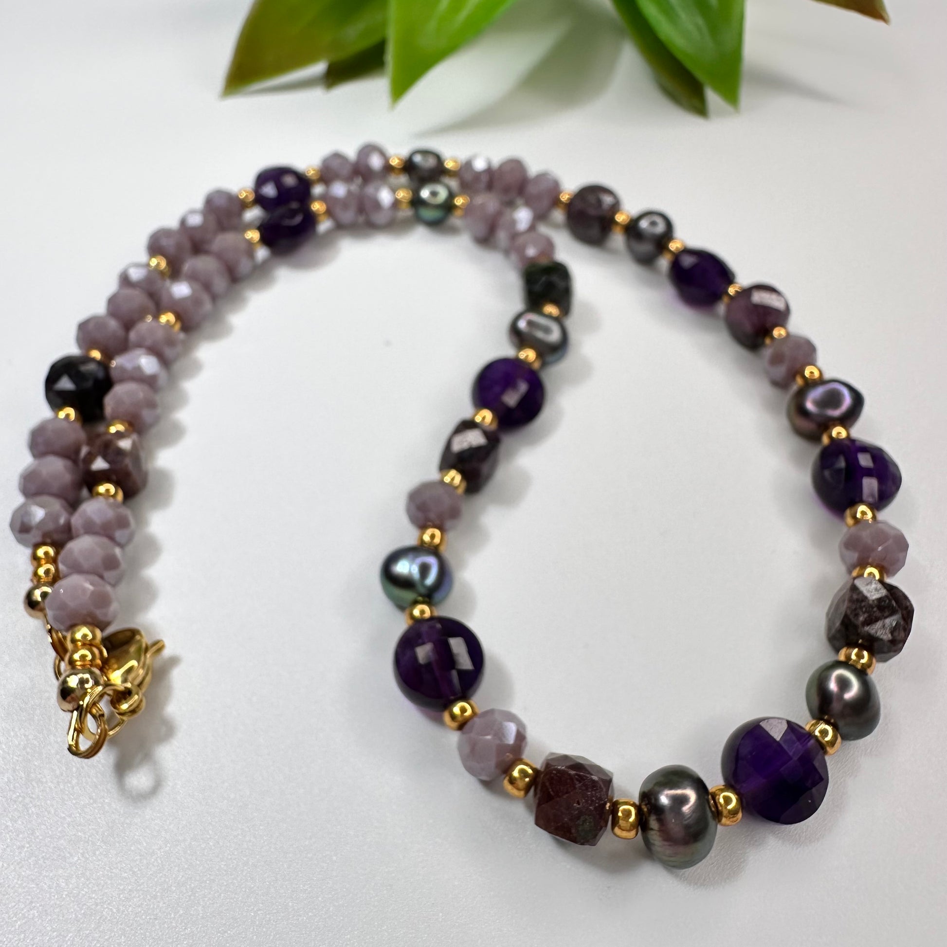 De ketting is afgewerkt met goudkleurige Miyuki (tussen)kralen, lila kleurige glaskralen (facetgeslepen) en een goudkleurig karabijnslot van stainless steel.